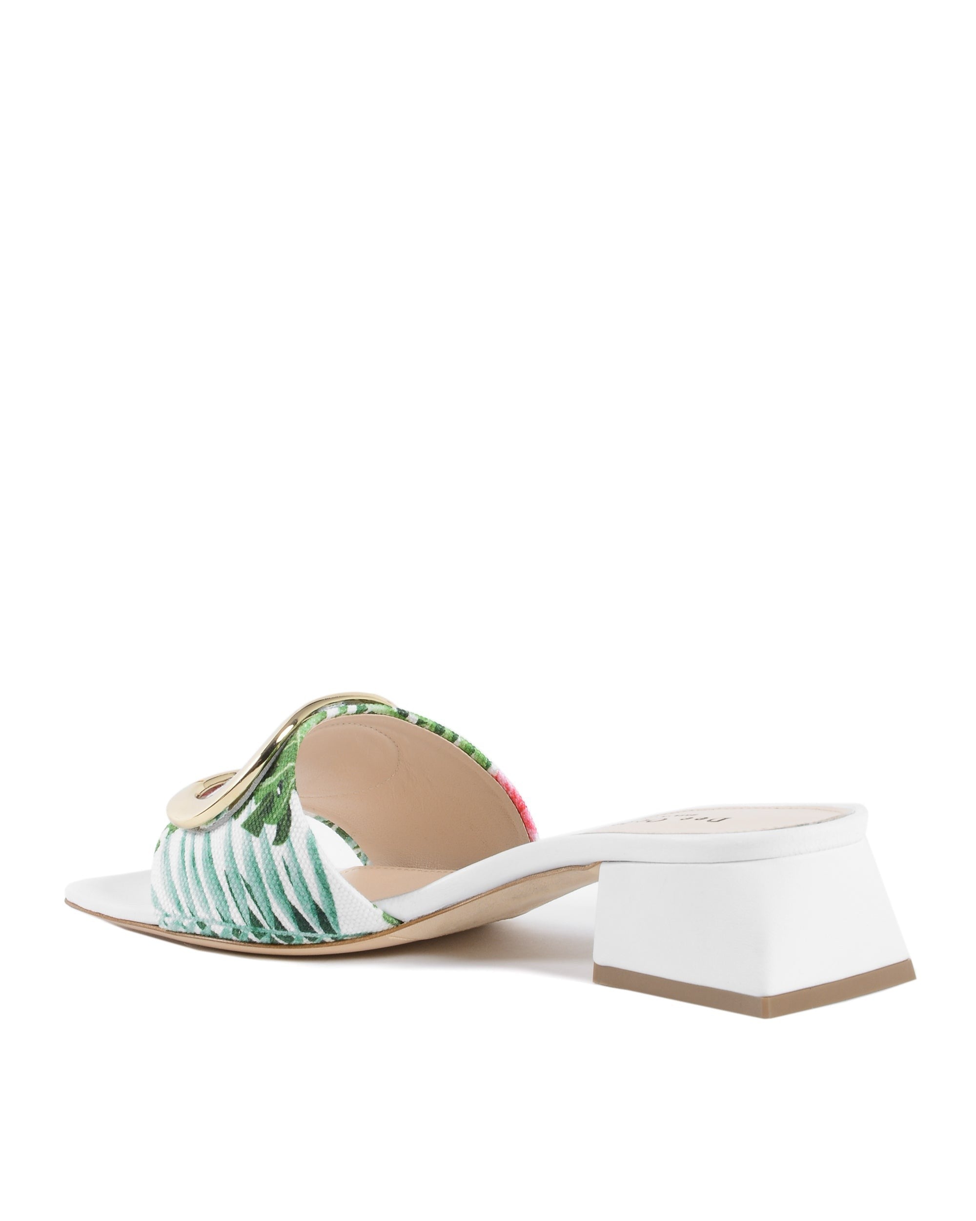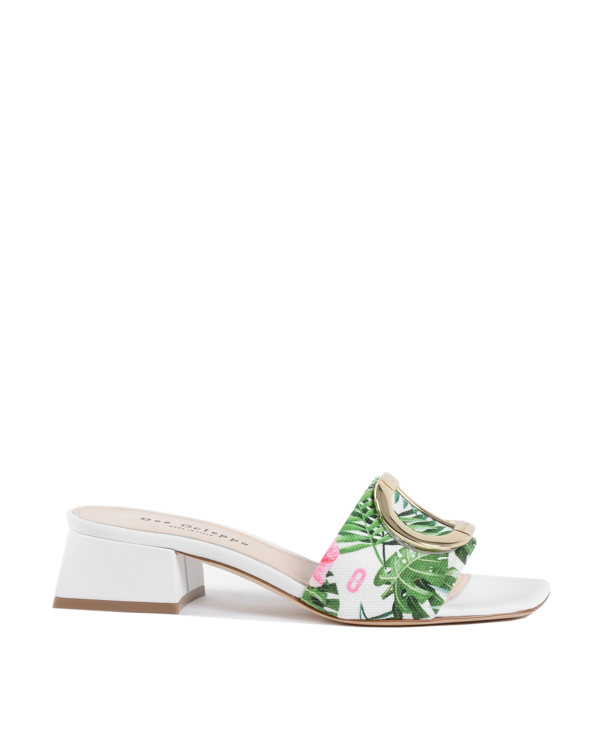 Made for summer days and getaways our Dee Dizzy Mule is crafted with a flat leather sole and with our signature Gold logo. This printed canvas slider sandals are an effortless addition to daytime looks. 3,5 Heel and made in 100% Leather Made in italy