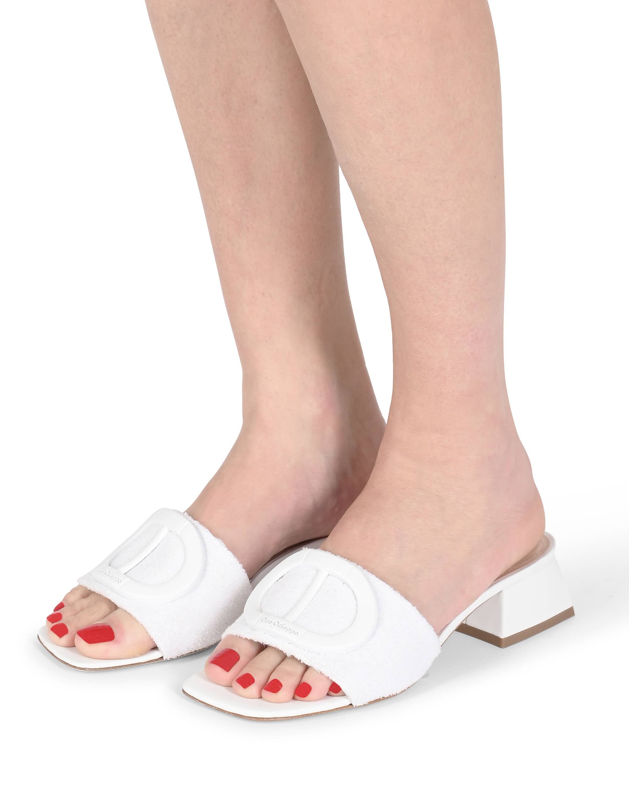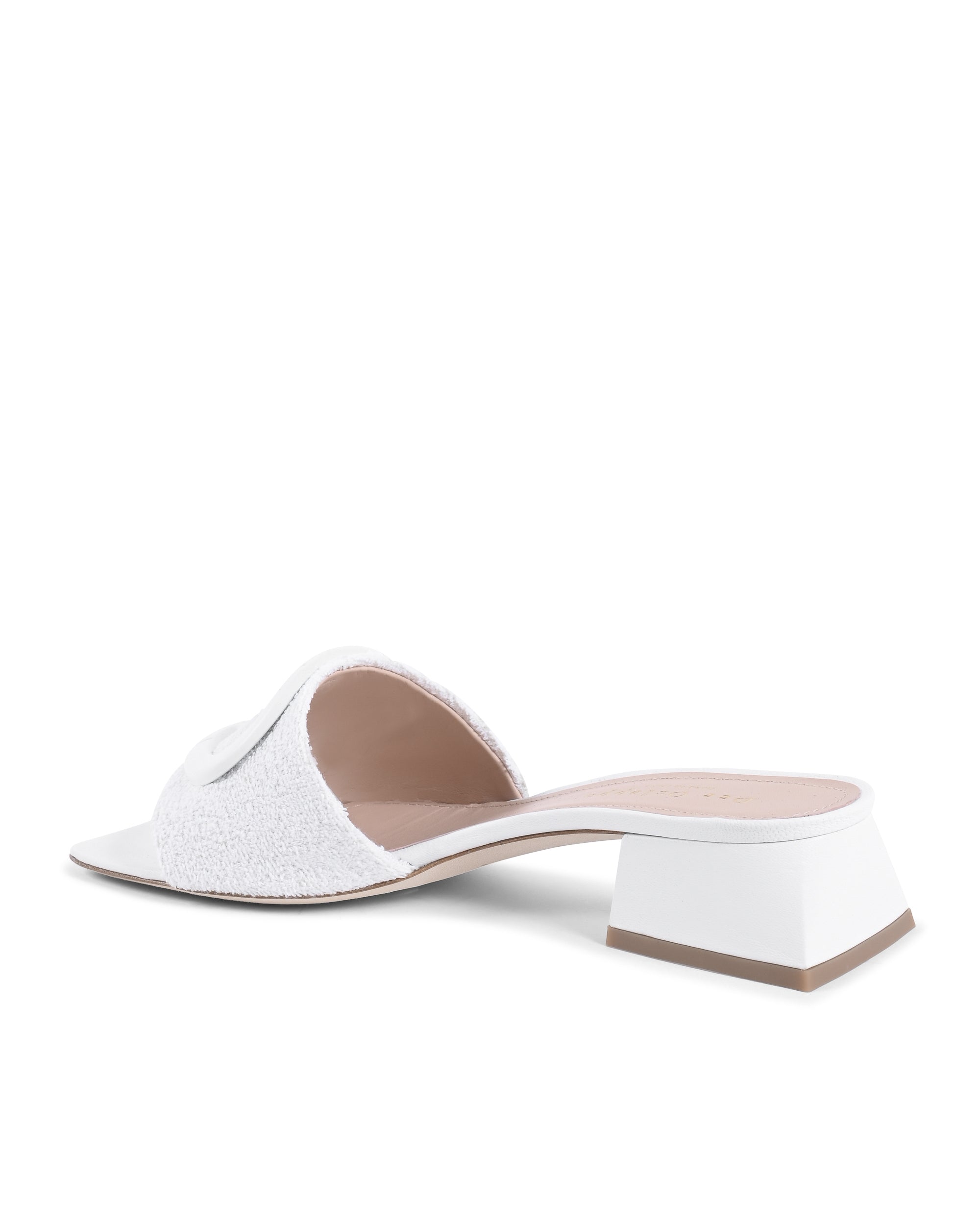 Made for summer days and getaways our Dizzy Terry Mule is made with terry cloth straps and contrasting leather soles and heels and with our signature tone on tone logo.