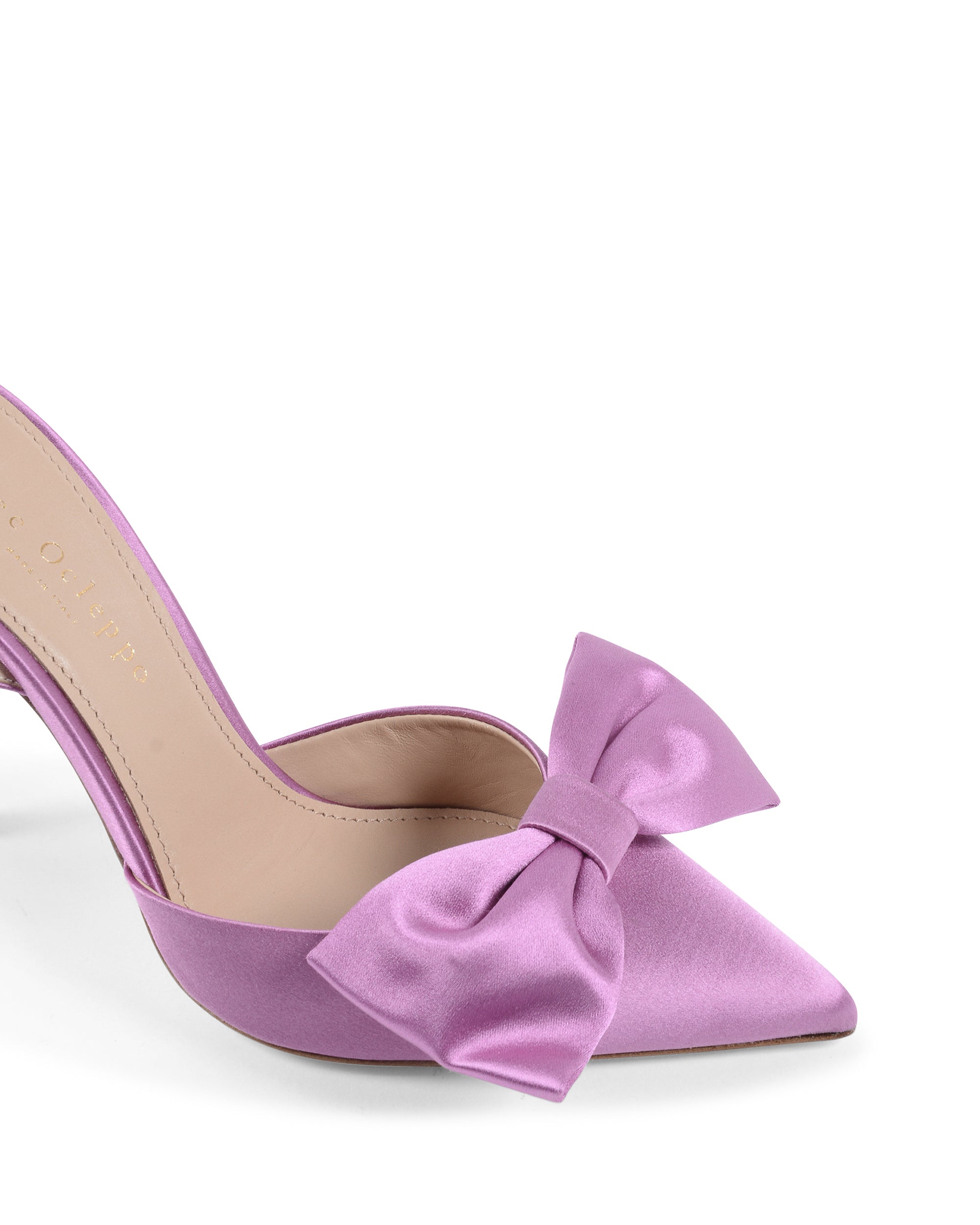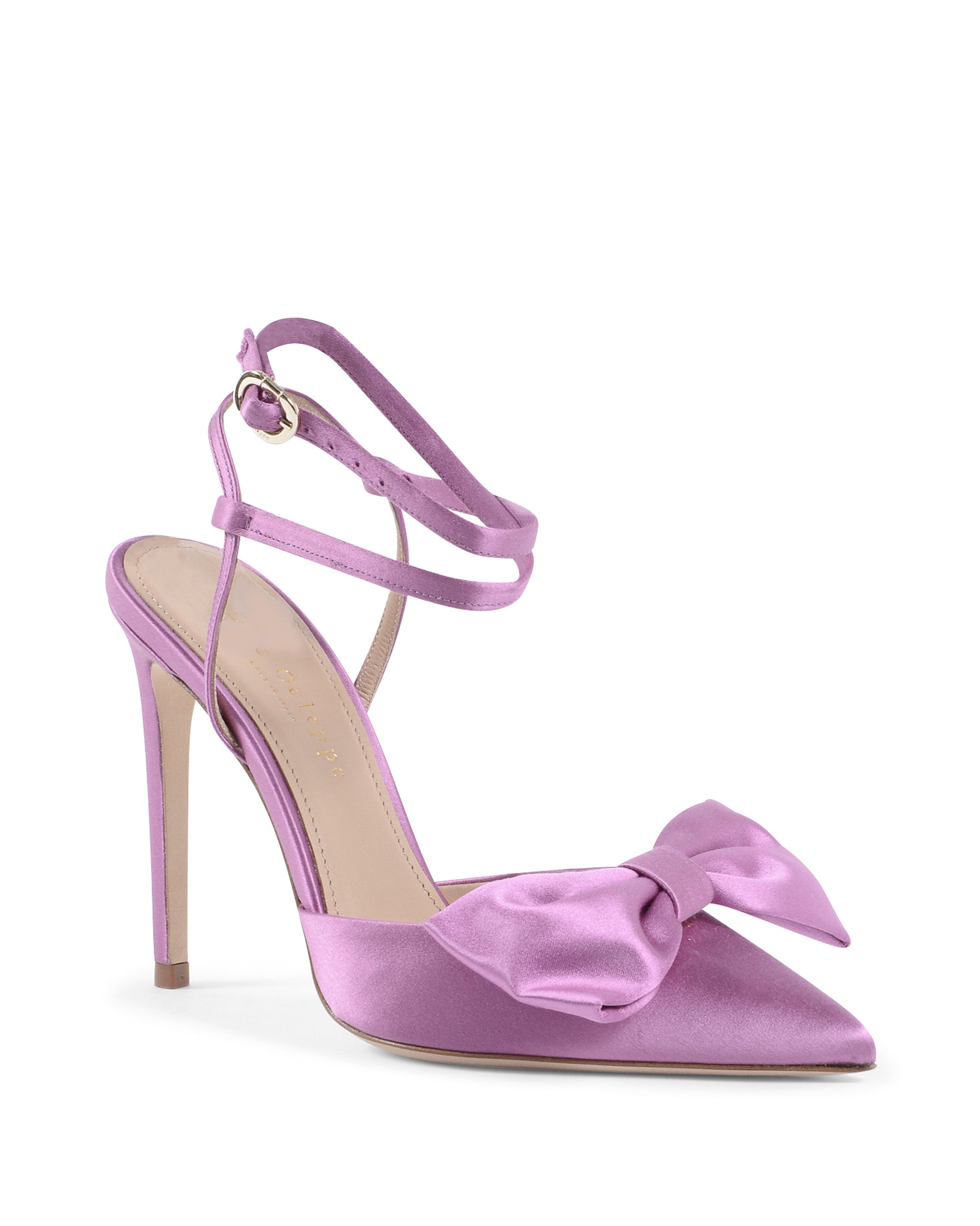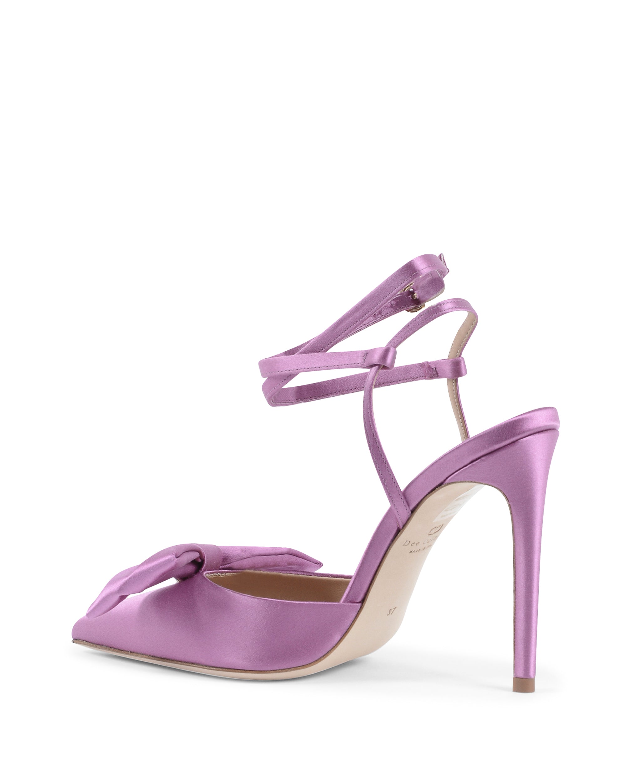 Poised for nights out in our purple satin pump, this is a shoe shape familiar to fans of the brand: the stiletto heels, tone on tone Dee logo and pointed toes. Opt for mini and midi hemlines to best accentuate the lace-up ankle ties.