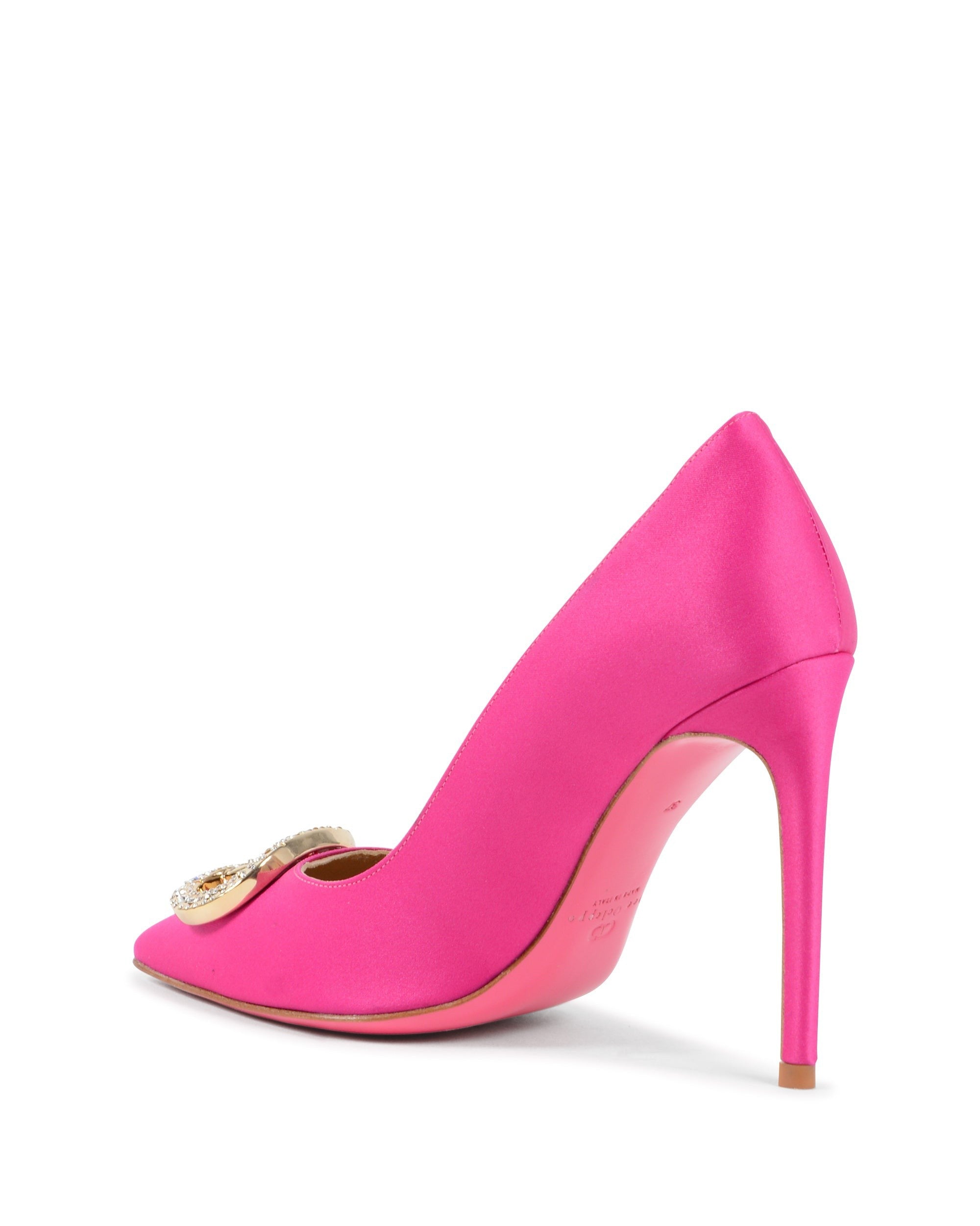 The Dee Cindarella Pump adds our signature logo to our most versatile heel. Giving our standard fuxia pump a refined update, this pump features a gold Dee Ocleppo logo and the classic Dee pink leather sole. This shoe is 100% satin. Heel height measures 10 cm.