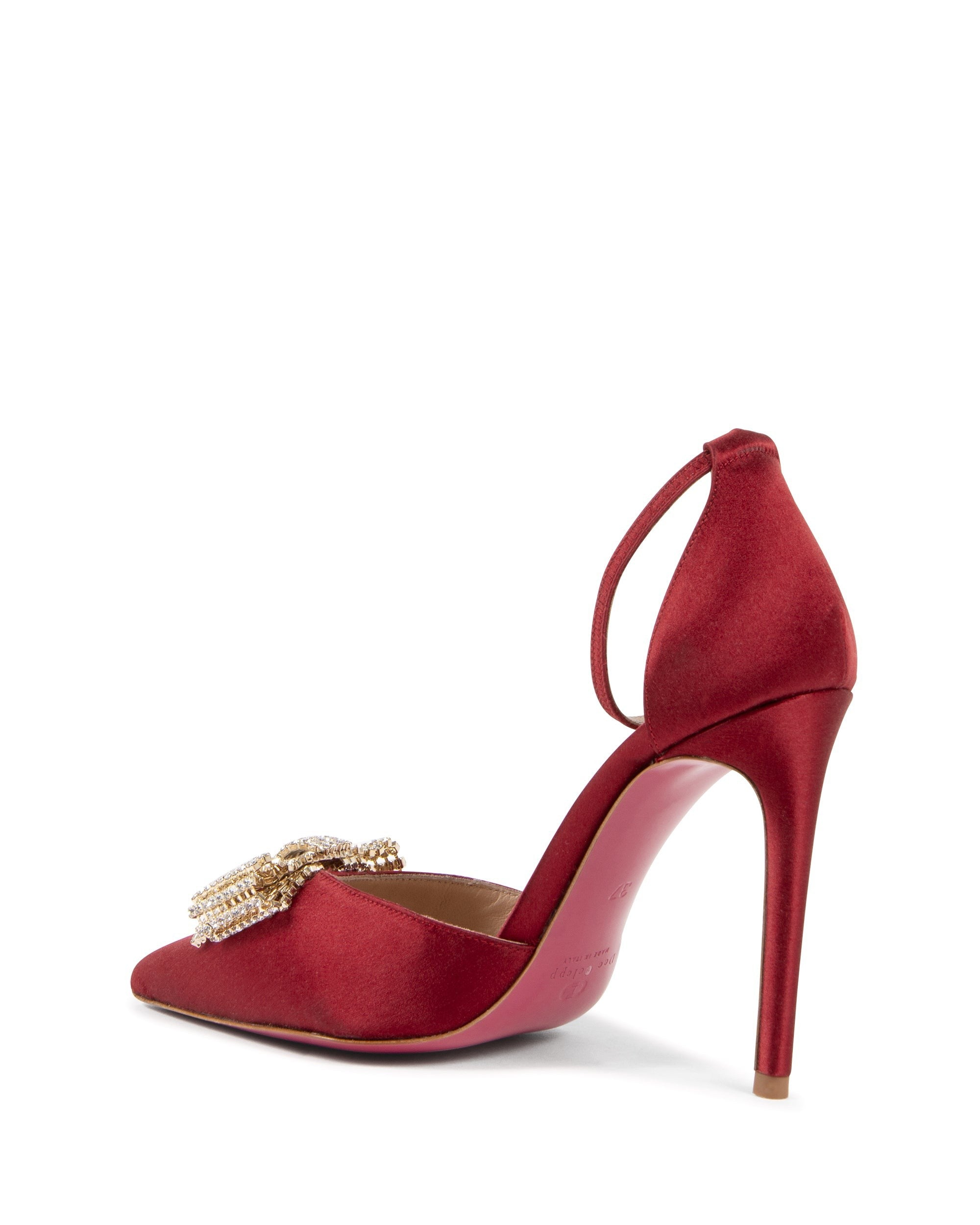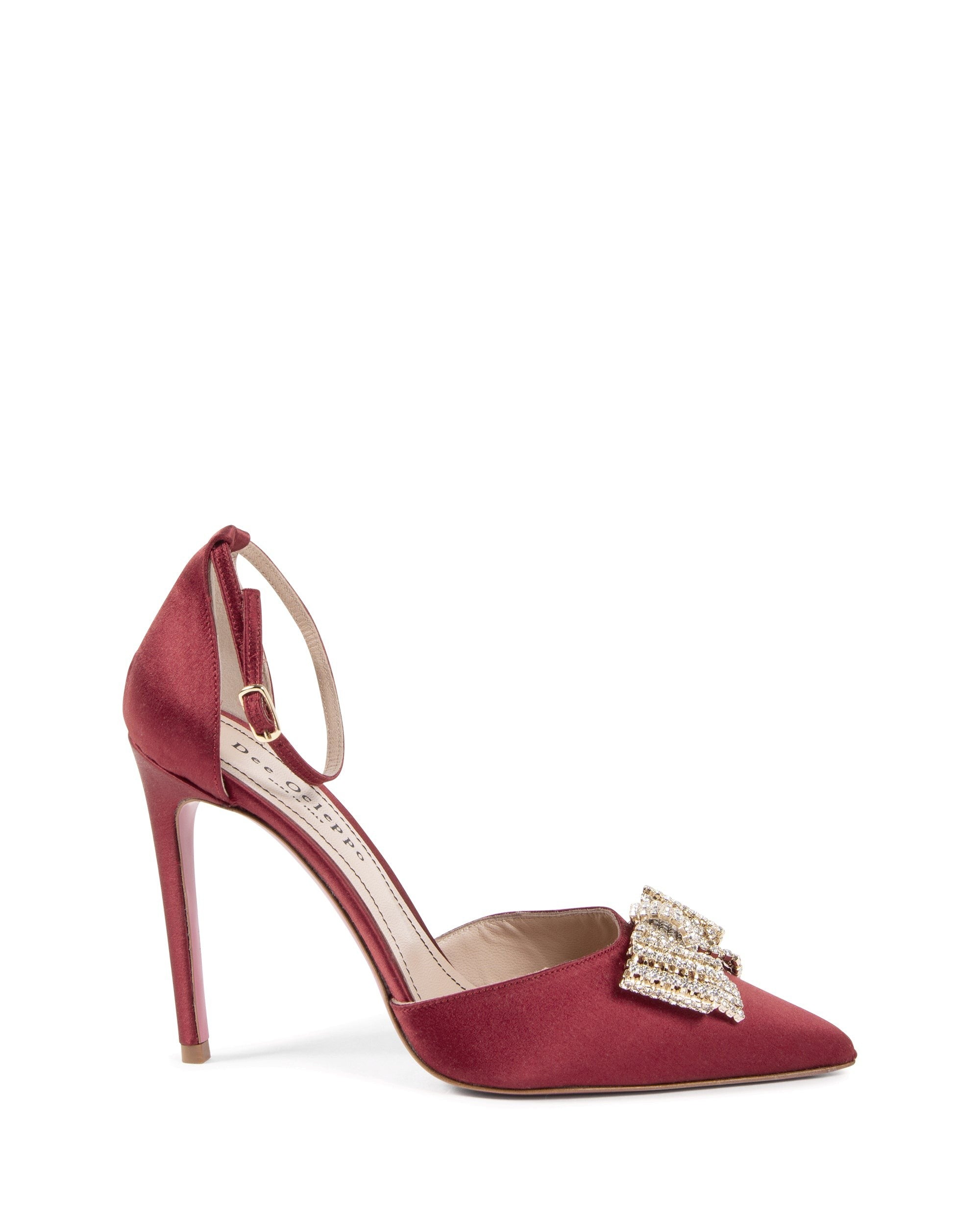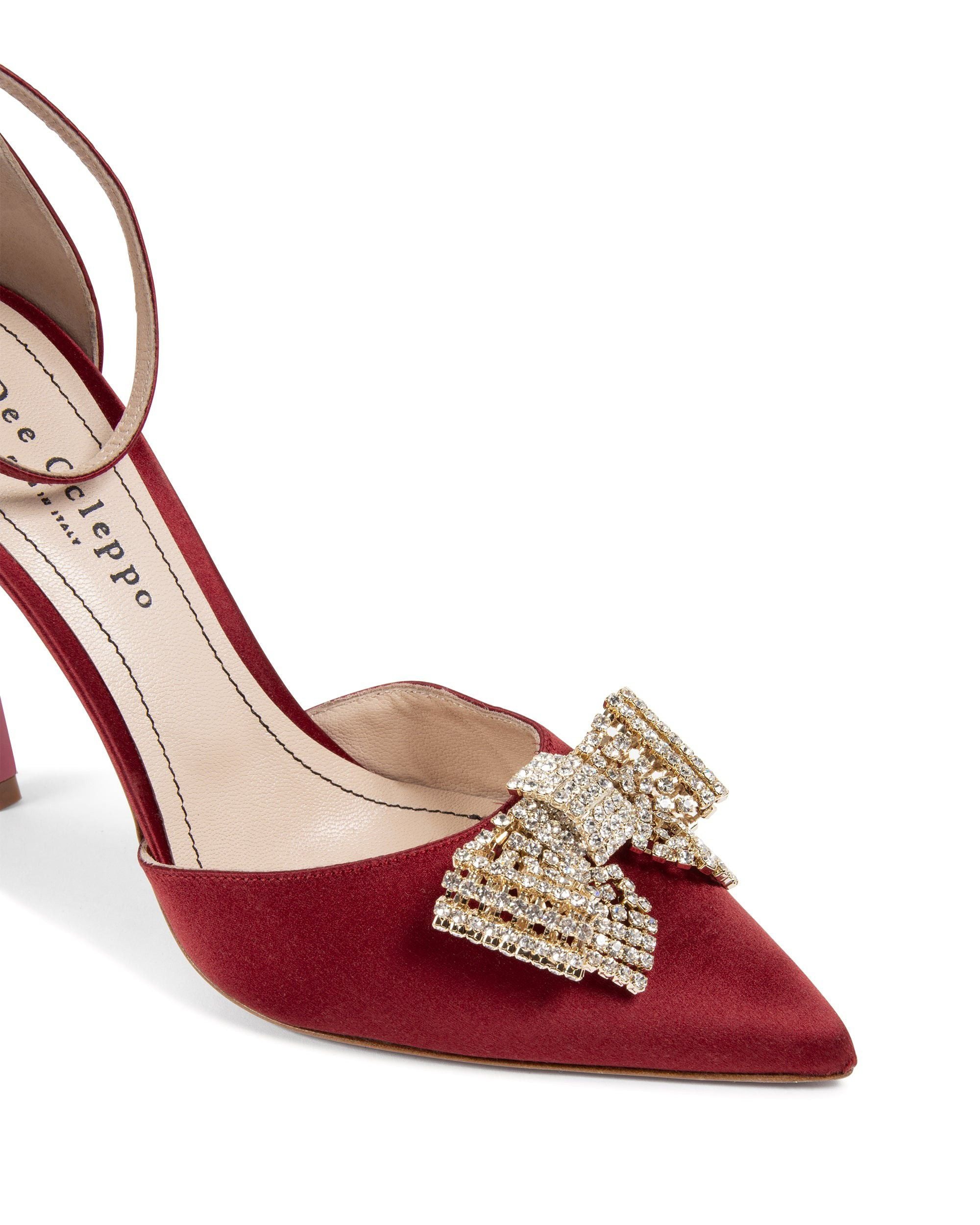 This sophisticated satin pump features a stunning crystal bow. This shoe is 100% satin and leather and is finished with the classic Dee pink sole. Heel height measures 10 cm.