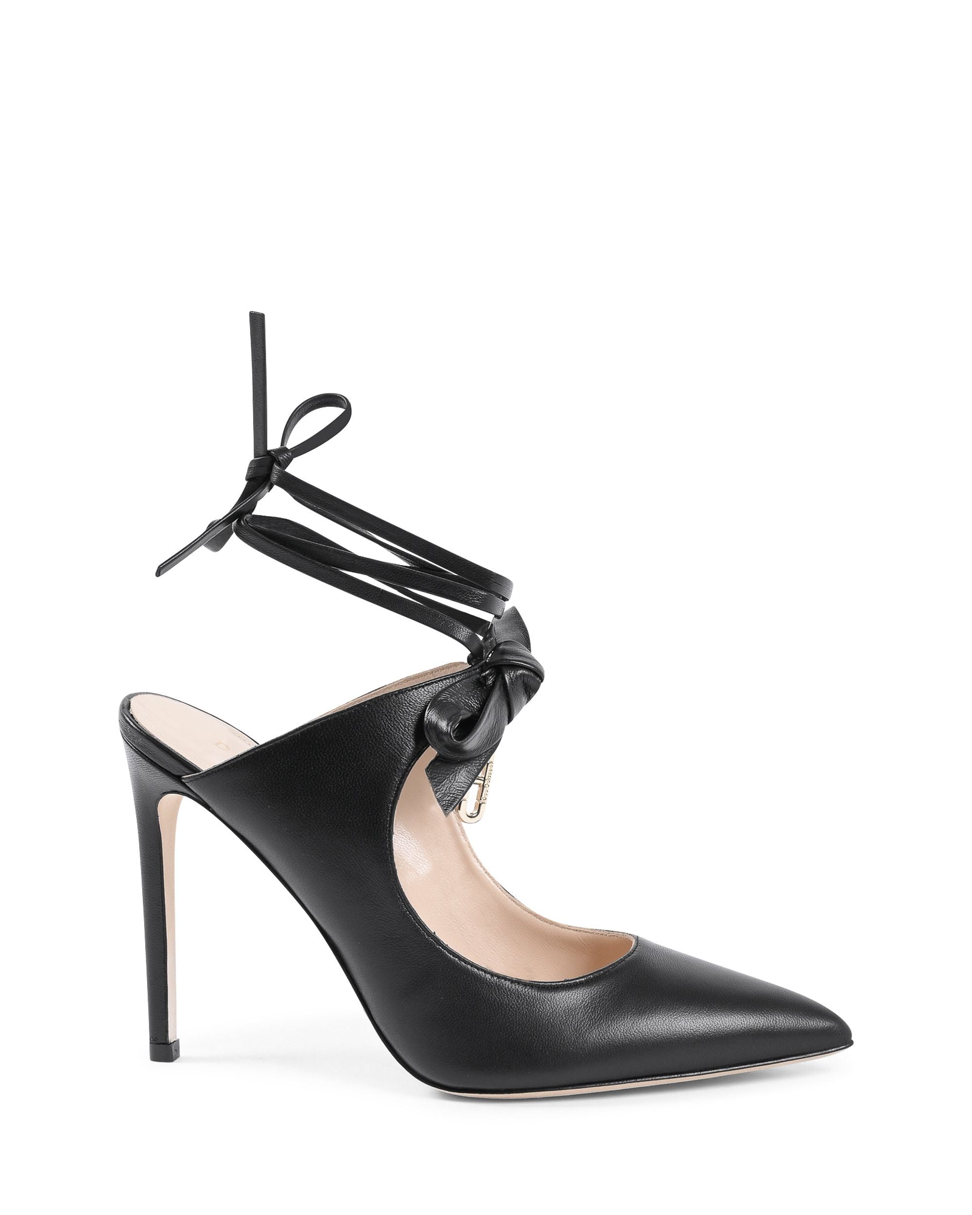 The Dominic mule flatters the foot with a pointed toe and a stylish bow on the front which is low-key, and simply chic. These shoes are made from lustrous leather and carry our monogram logo gold hardware on the front, have tie around ankle straps and have a 10cm stiletto heel.