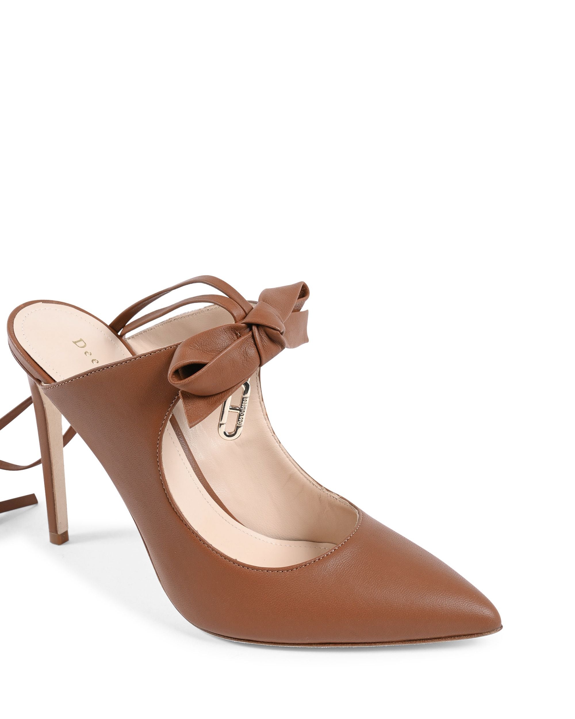 The Dominic mule flatters the foot with a pointed toe and a stylish bow on the front which is low-key, and simply chic. These shoes are made from lustrous leather and carry our monogram logo gold hardware on the front, have tie around ankle straps and have a 10cm stiletto heel.