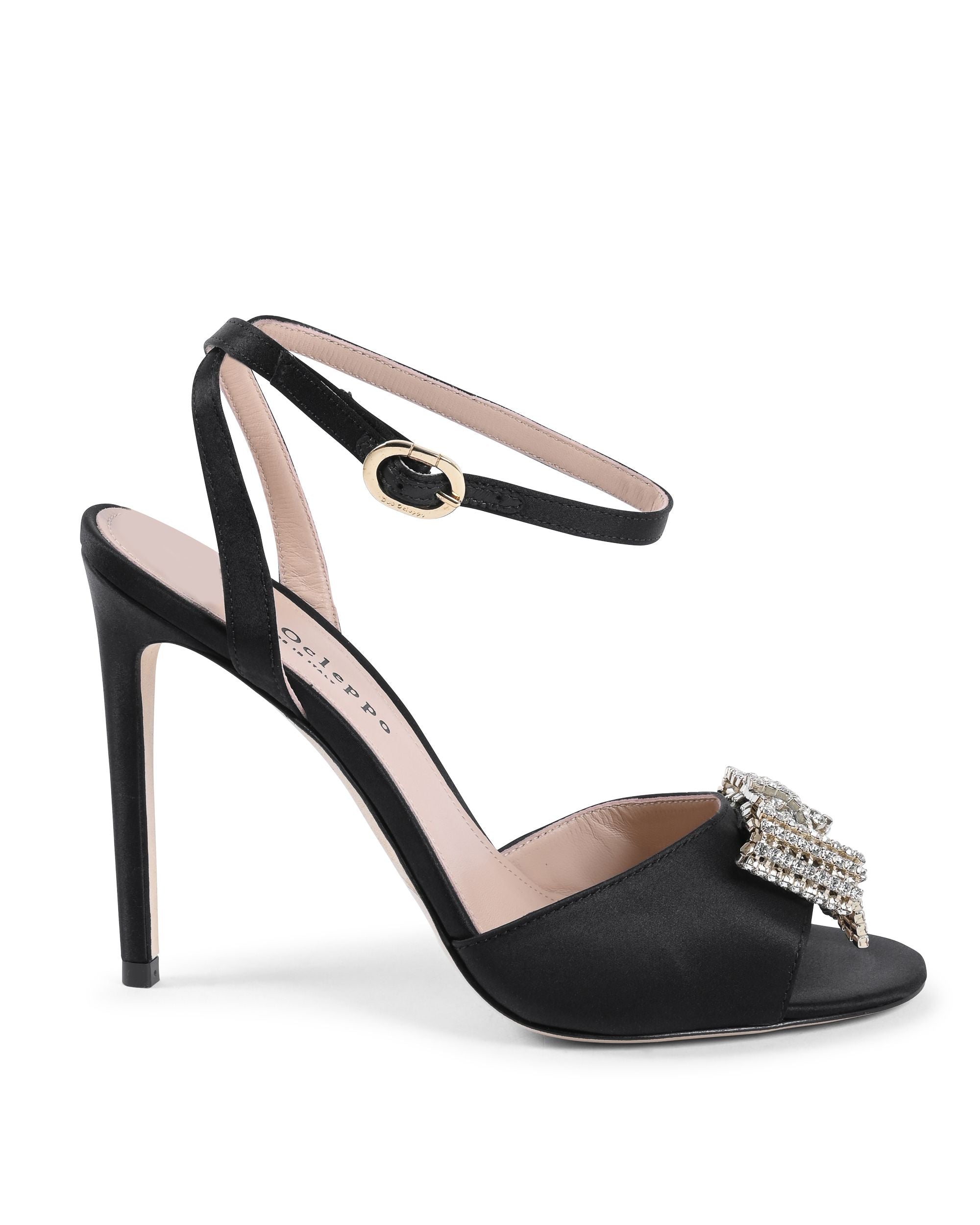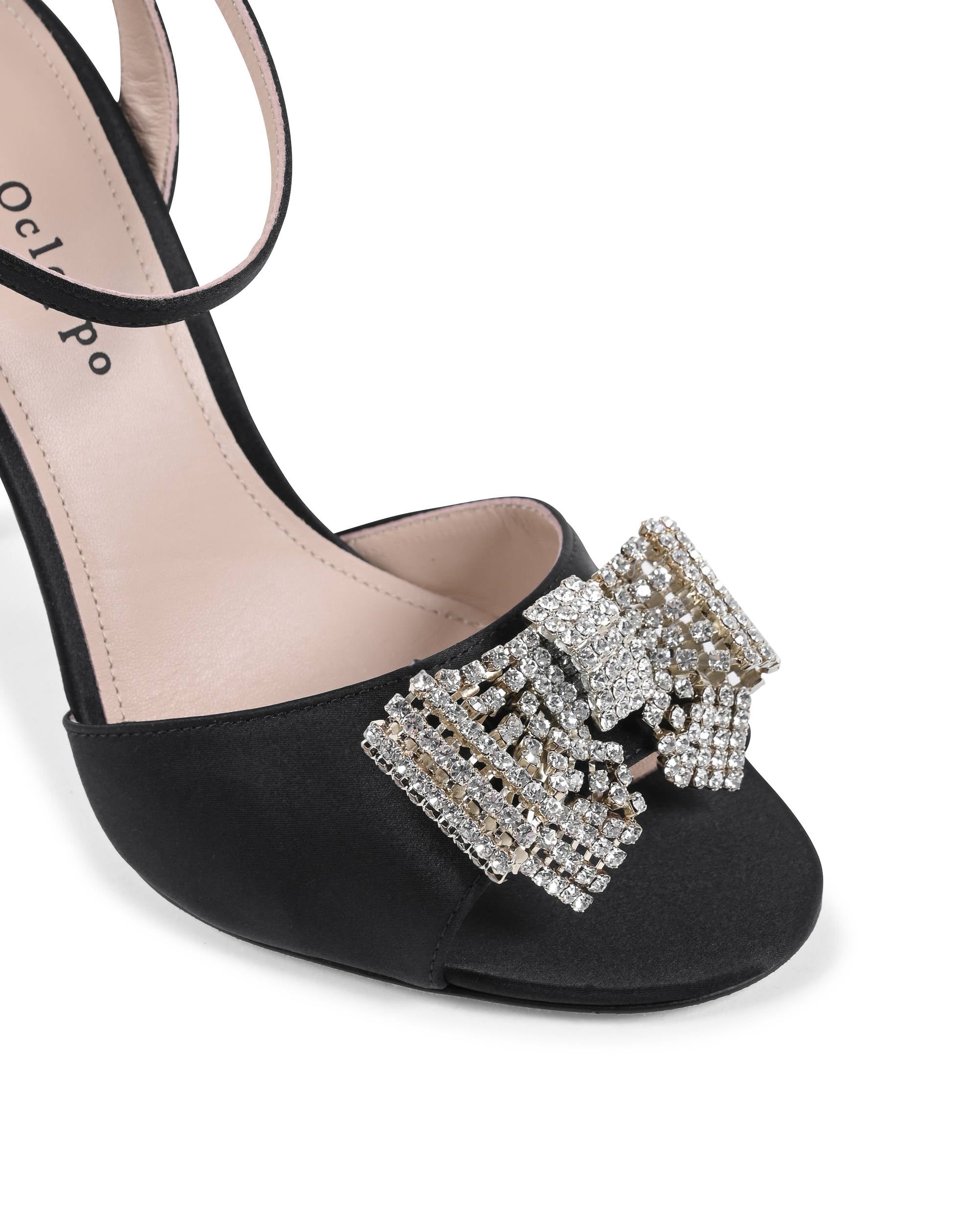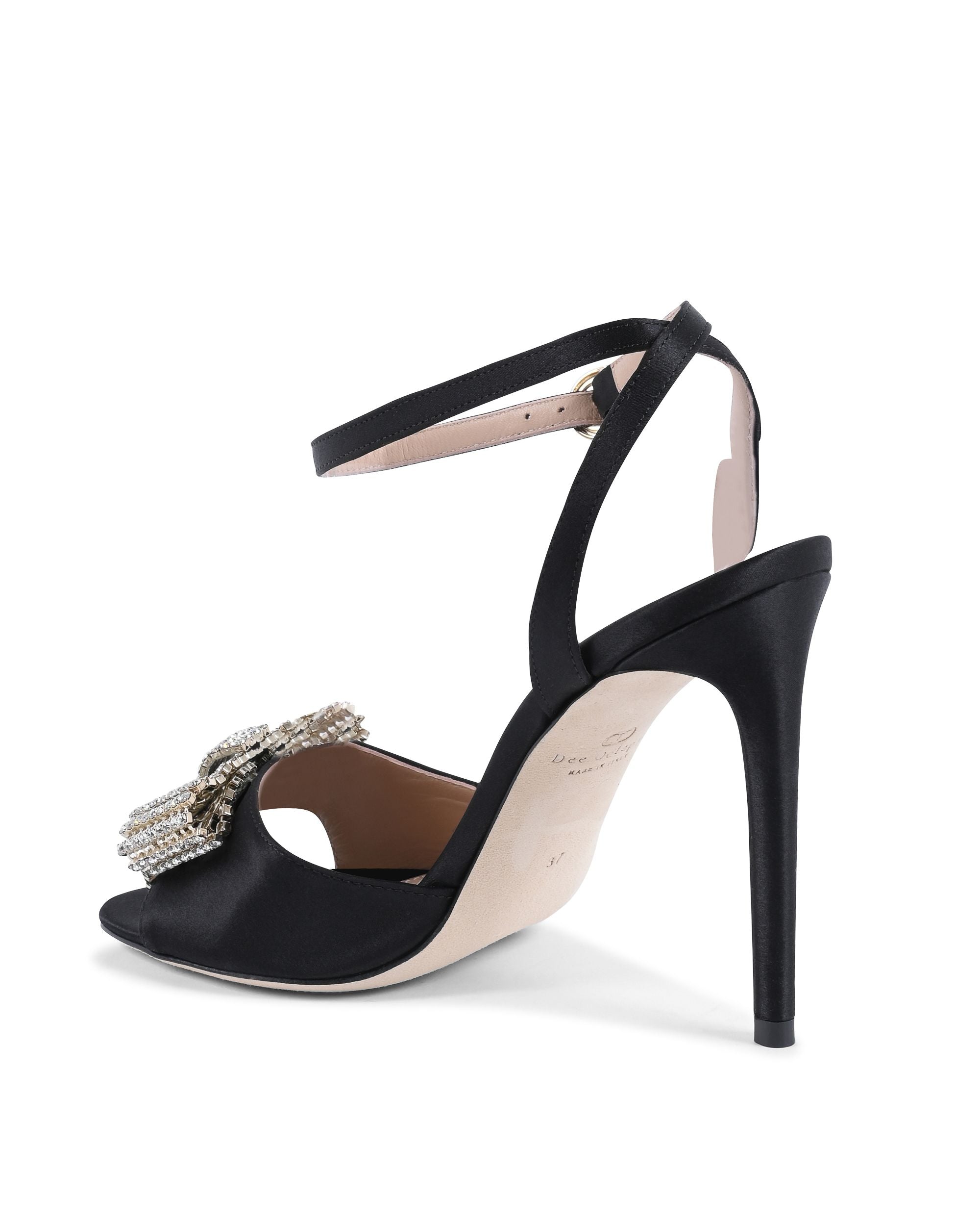 This stunning and sophisticated satin sandal features a brilliant swarovskyi crystal bow. This sandal is 100% satin and leather and is finished with the classic Dee pink sole. Heel height measures 10cm.