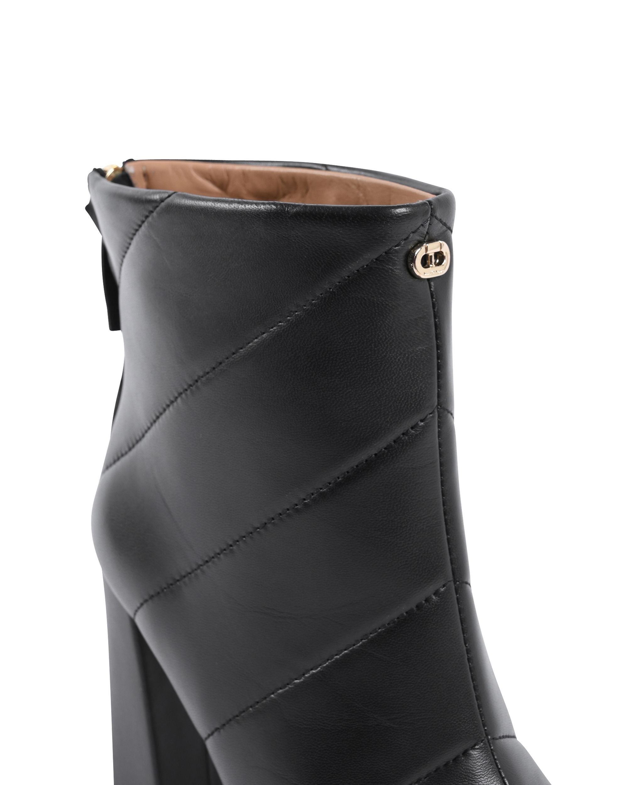 Mantenga sus tardes frías con estilo con estas botas de cuero pulido acolchado hasta el tobillo. Punta cuadrada con cierre de cremallera en el tobillo.