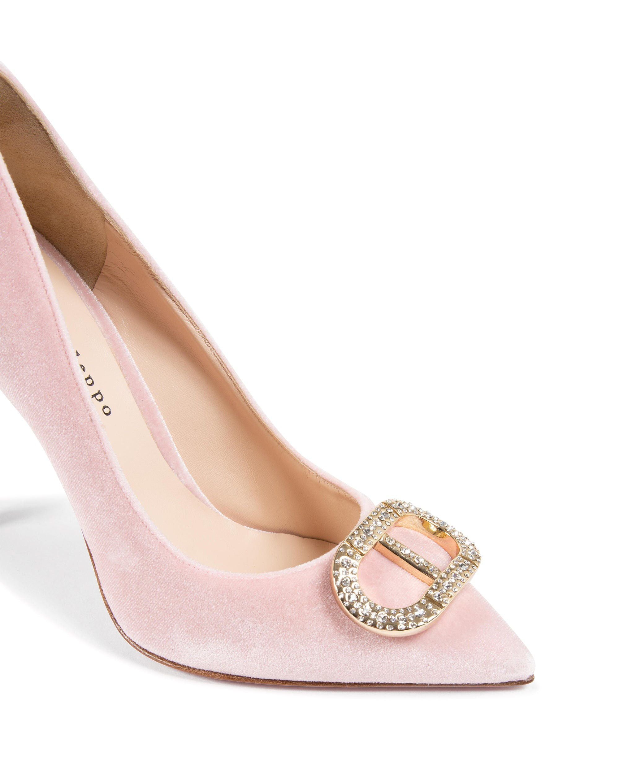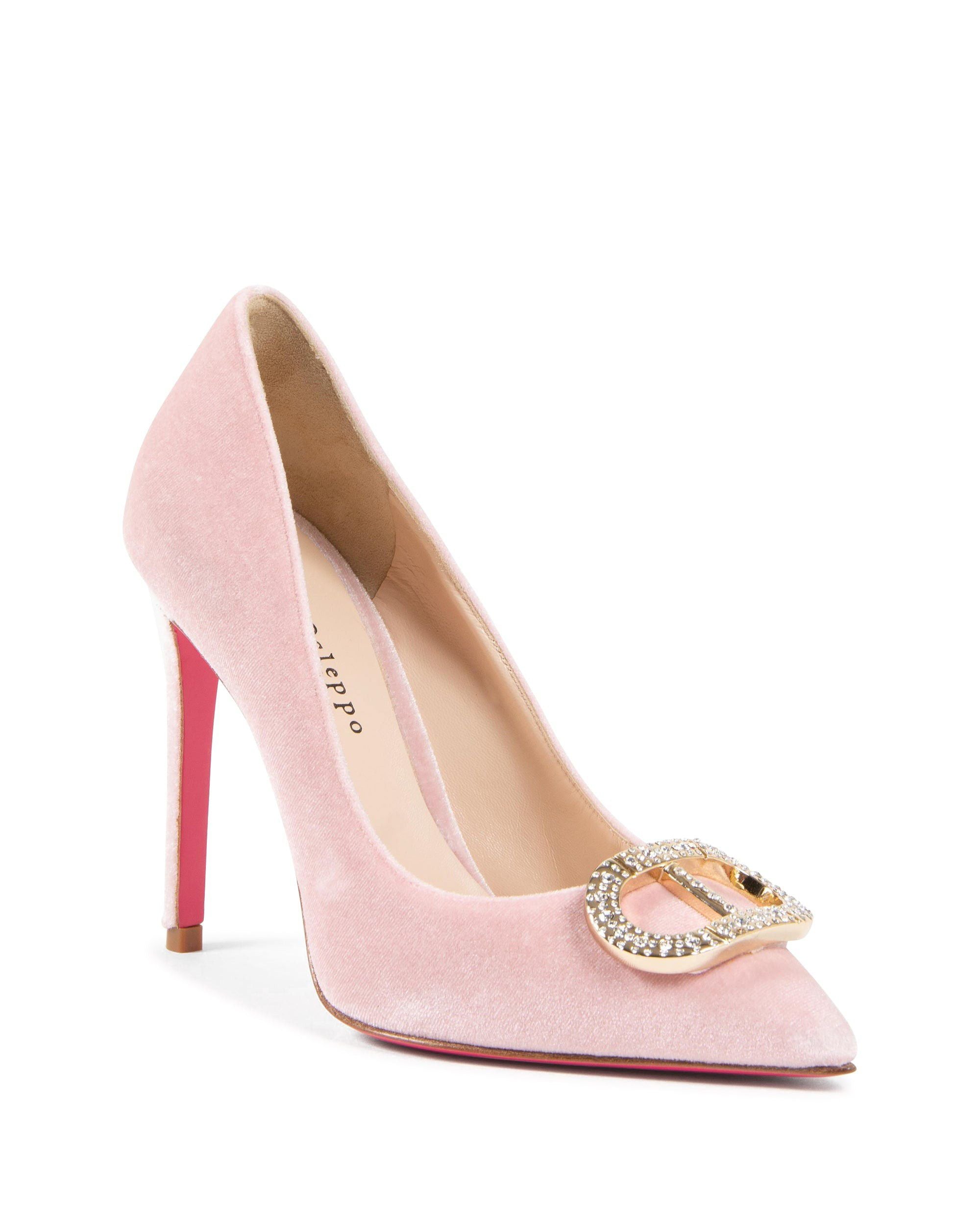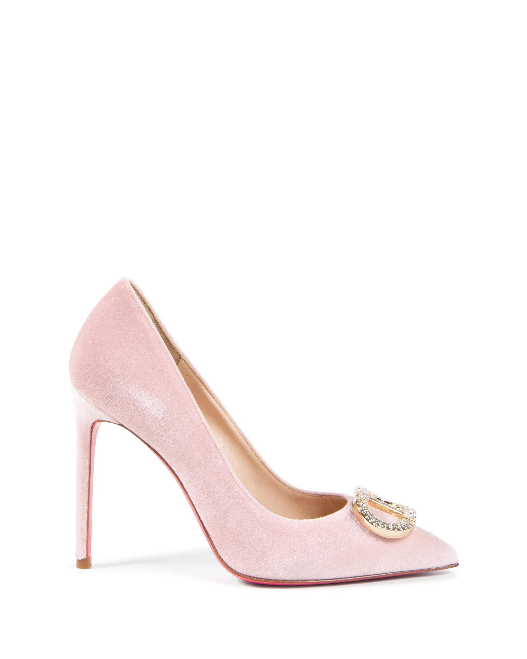 Nuestros zapatos de salón clásicos dan un giro con un tono negro, un logotipo dorado y una composición 100 % terciopelo. La suela 100 % de piel, en nuestro clásico rosa fuerte, y la altura del tacón de 10 cm crean un efecto de alargamiento de las piernas. Este toque de color seguramente llamará la atención esta temporada.
