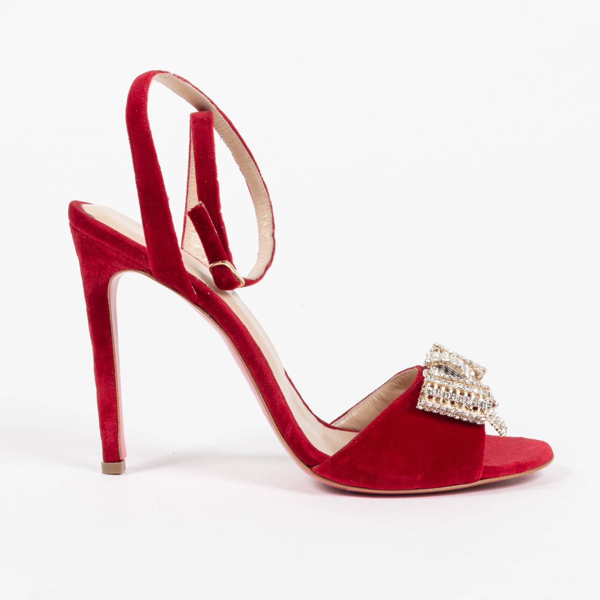 Cette superbe et sophistiquée sandale en velours est ornée d’un nœud en cristal swarovskyi brillant. Cette sandale est 100% velours et cuir et est finie avec la semelle rose Dee classique. La hauteur du talon mesure 10 cm