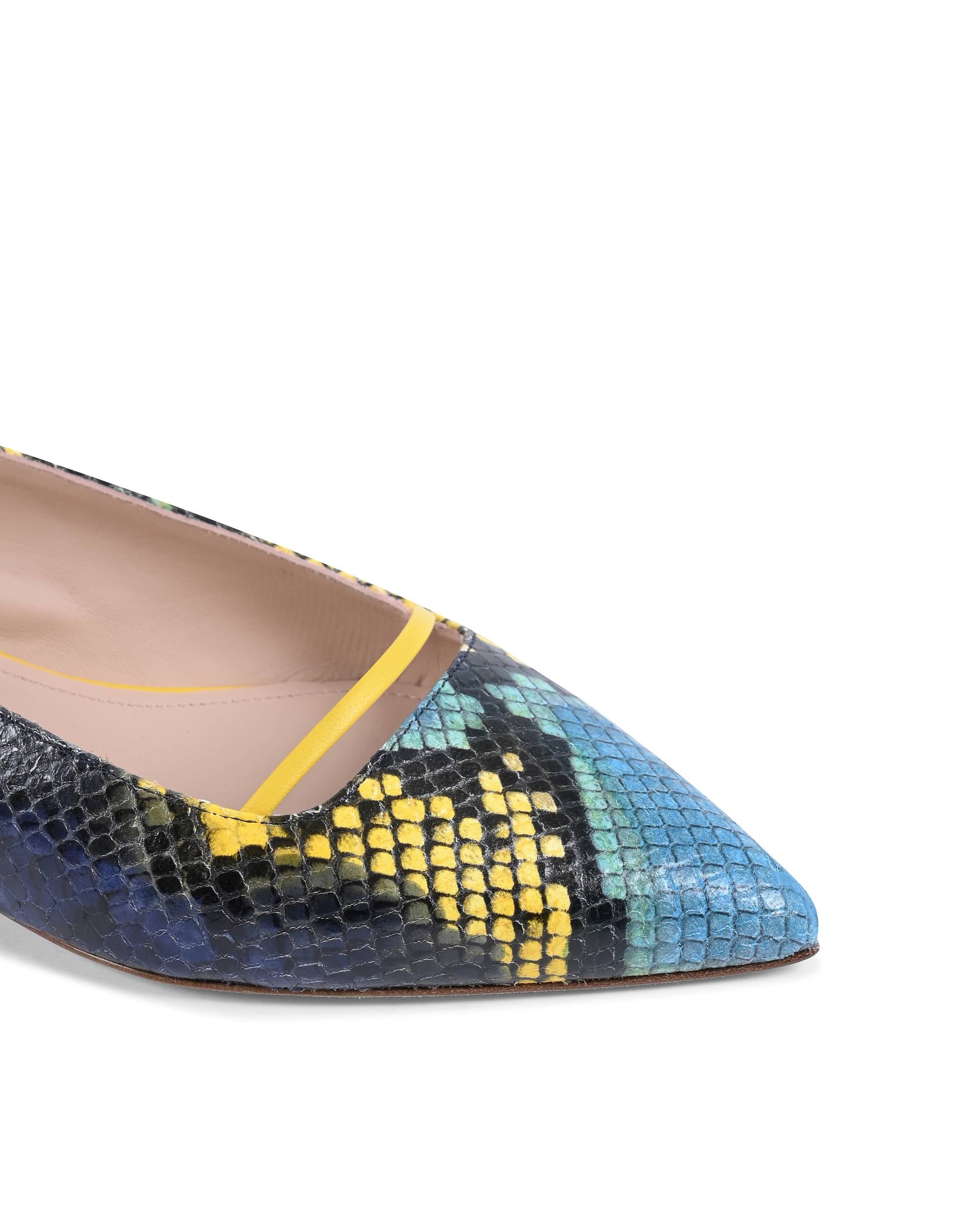 Fabriqué en Italie par les meilleurs artisans italiens, ce slingback à bout pointu avec lacets d’esclave doublé de cuir véritable avec un talon bas de 1 cm convient absolument pour accompagner vos journées dans un confort total, mais aussi avec cette touche supplémentaire de python imprimé coloré .