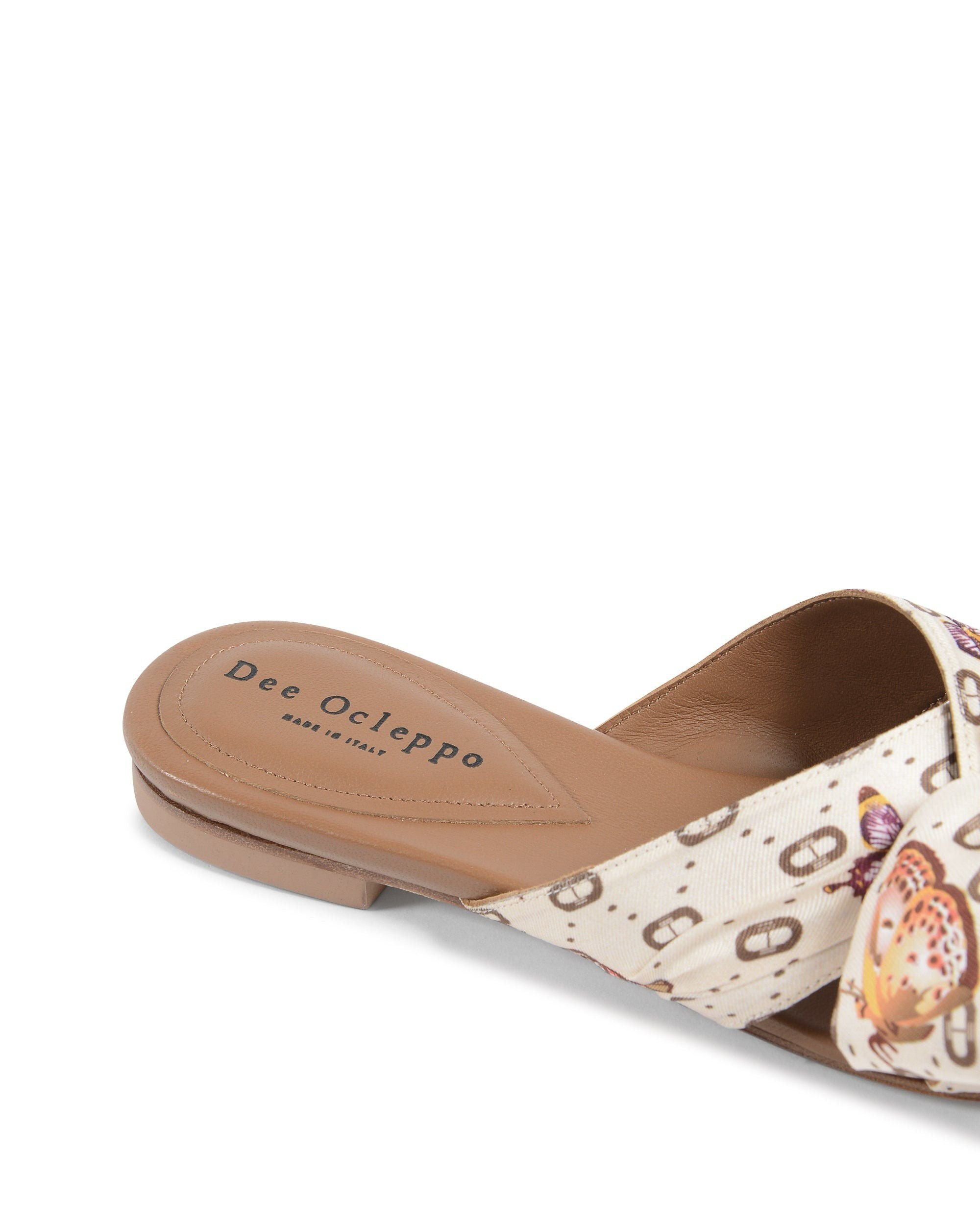 Cette mule en soie avec un nœud imprimé et une semelle plate est idéale pour une journée d’été confortable et confortable, pleine de joie et de plaisir. Fabriqué en Italie 100%